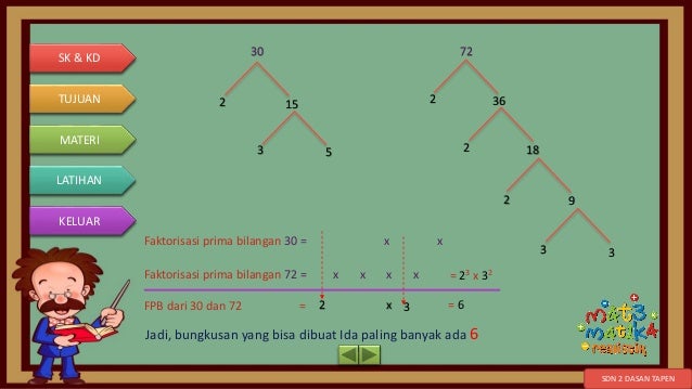 Bisa menentukan kpk dan fpb dari suatu. Tentukan kpk dari bilangan 36 dan 64. Penentuan kpk dari bilangan tertentu dapat dilakukan dengan berbagai cara di antaranya adalah di bawah ini hasil faktorisasi 30 = 2 x 3 x 5 dipangkatkan menjadi 2 x 3 x 5. Cara mencari faktor prima suatu bilangan menggunakan pohon faktor adalah dengan membagi bilangan secara terus menerus dengan bilangan prima dilanjutkan dengan mengalikan semua bilangan hasil faktorisasi prima dengan menggunakan pangkat terbesar. Untuk mencari kpk dan fpb diperlukan hal tentang bilangan prima juga faktorisasi prima, apa maksud dari kedua ungkapan tersebut :